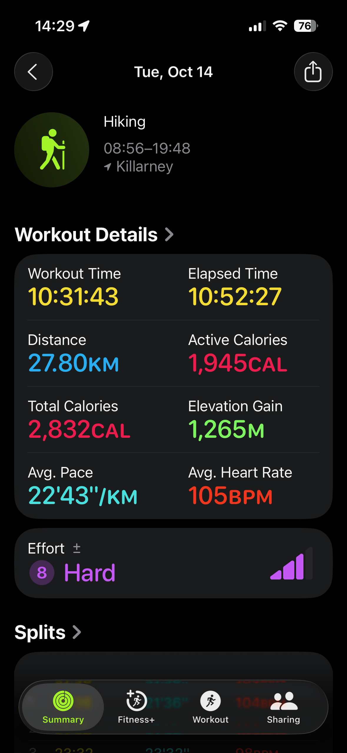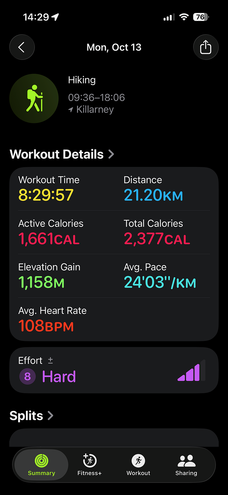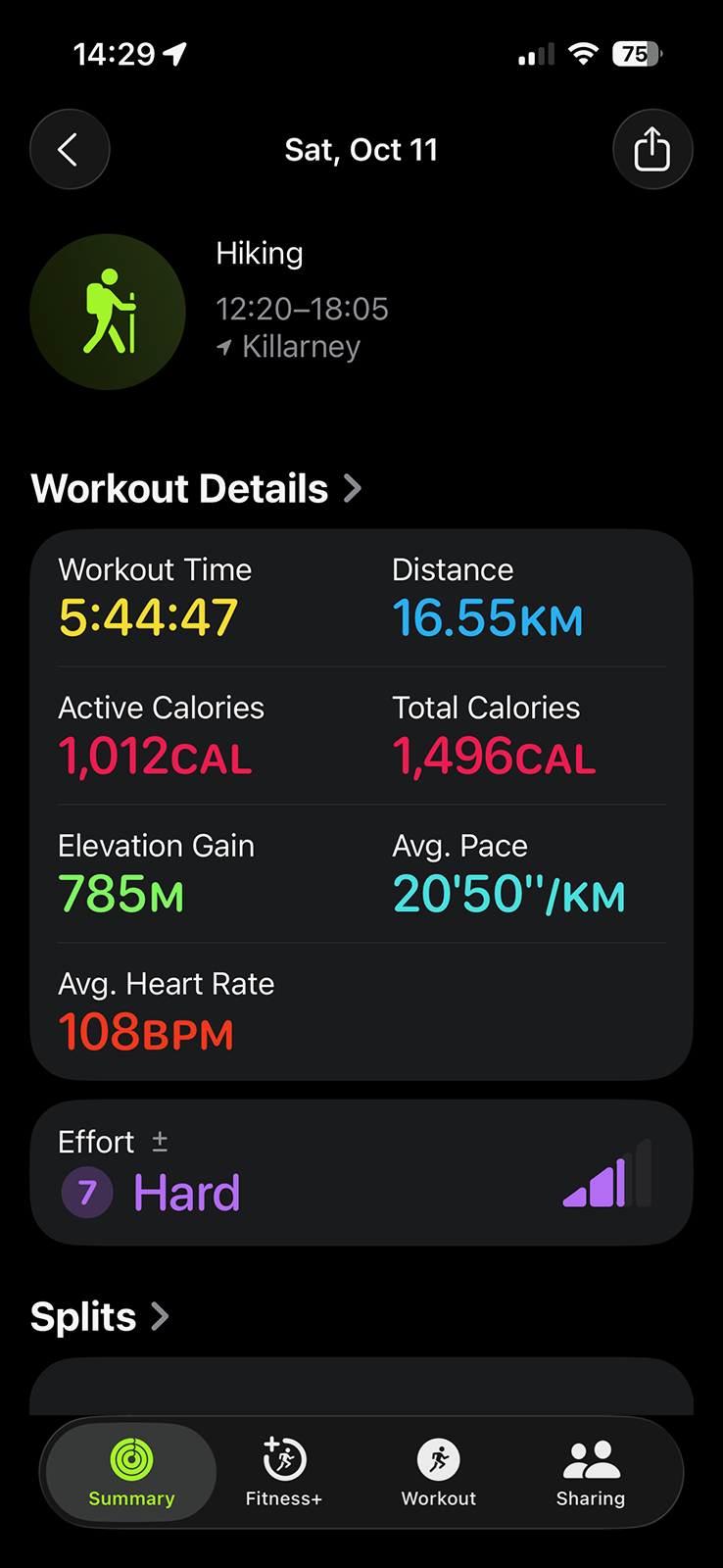 I was tired but not sleepy, so I lay in my sleeping bag with Porthos snoring beside me and checked the Apple Fitness summary. The numbers didn’t add up. The expected distance between H16 and H23—listed as 16 kilometres in both Killarney Outfitters’ chart and the digital version of Jeff’s Map—showed as 19 kilometres on my Apple Watch. I started to suspect drift in the numbers around H20, but it became obvious when the watch chimed 16 kilometres just before the waterfalls. Poor signage might have added some extra distance, but not three full kilometres.